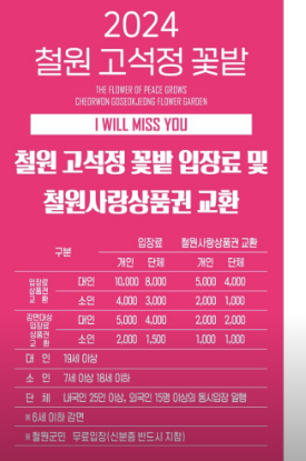 철원 고석정 꽃밭 축제는 비교적 저렴한 편으로 가족 단위 방문객들도 부담 없이 즐길 수 있습니다. 입장료는 현장에서 구입 가능하며 할인 및 무료입장도 가능하니 자세한 내용을 확인해 보세요!