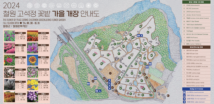 철원 고석정 꽃밭 축제의 가장 큰 매력은 대규모 꽃밭에서 펼쳐지는 자연의 아름다움과 함께, 고석정 일대의 풍부한 자연경관을 동시에 즐길 수 있다는 점입니다. 이곳은 단풍과 꽃이 어우러져 가을의 절경을 감상할 수 있는 명소로, 꽃을 배경으로 걷는 산책은 도심 속에서 느끼기 힘든 평온함을 줍니다. 올해에는 천일홍, 백일홍 가우라, 억새, 핑크뮬리, 만들라마, 코스모스 해바라기, 여우꼬리맨드라미 황화코스모스, 버베나 등 화려하고 다양한 꽃들을 볼 수 있습니다.